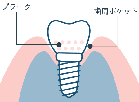 歯面や人工歯とインプラントの接合部に溜まったプラークが原因で歯肉などの粘膜で炎症を起こし、歯周ポケットが深くなっていきます。